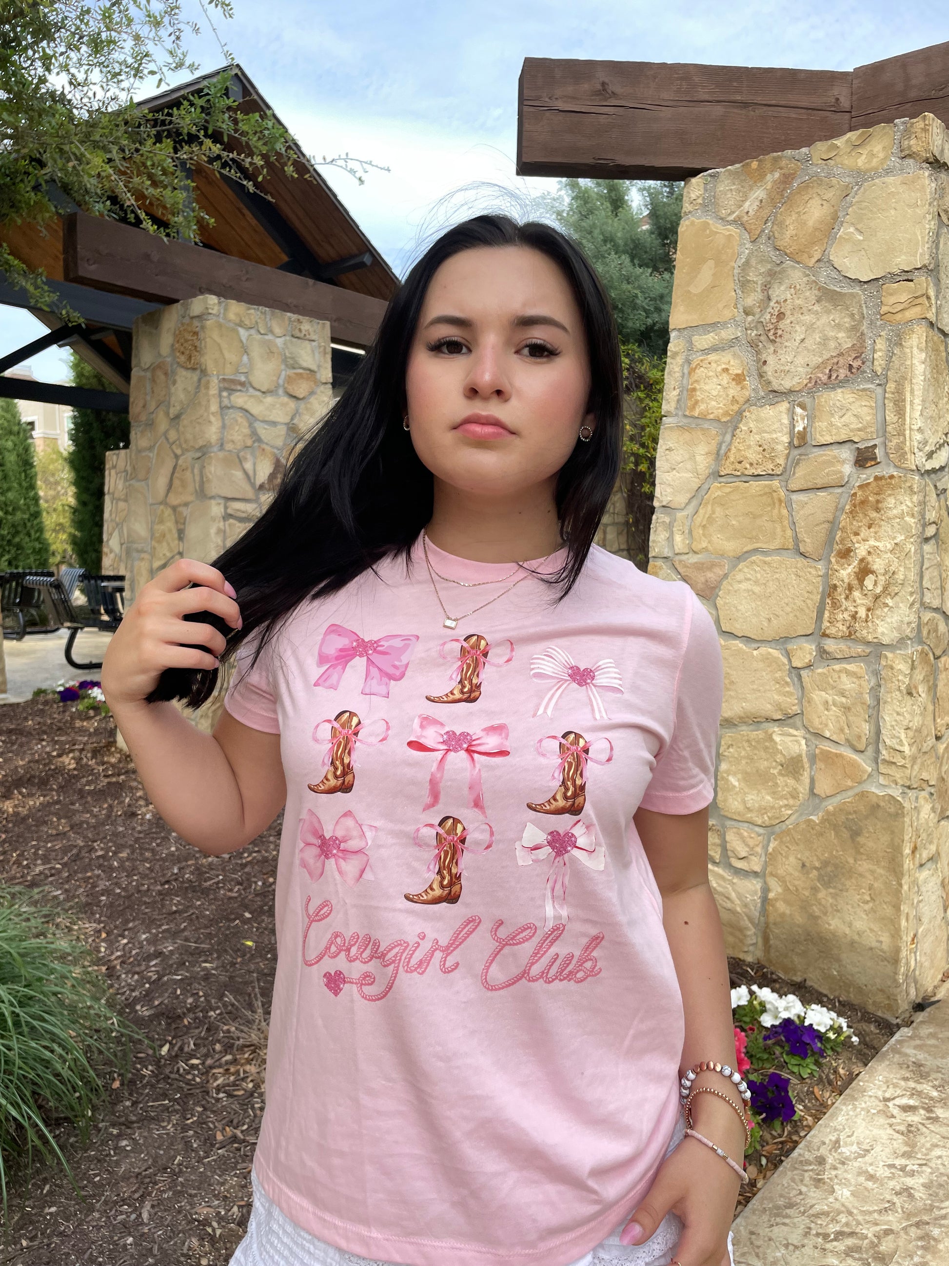 Cute womens cowgirl club graphic T-shirt. Boots and bows with rhinestone glittery hearts!!