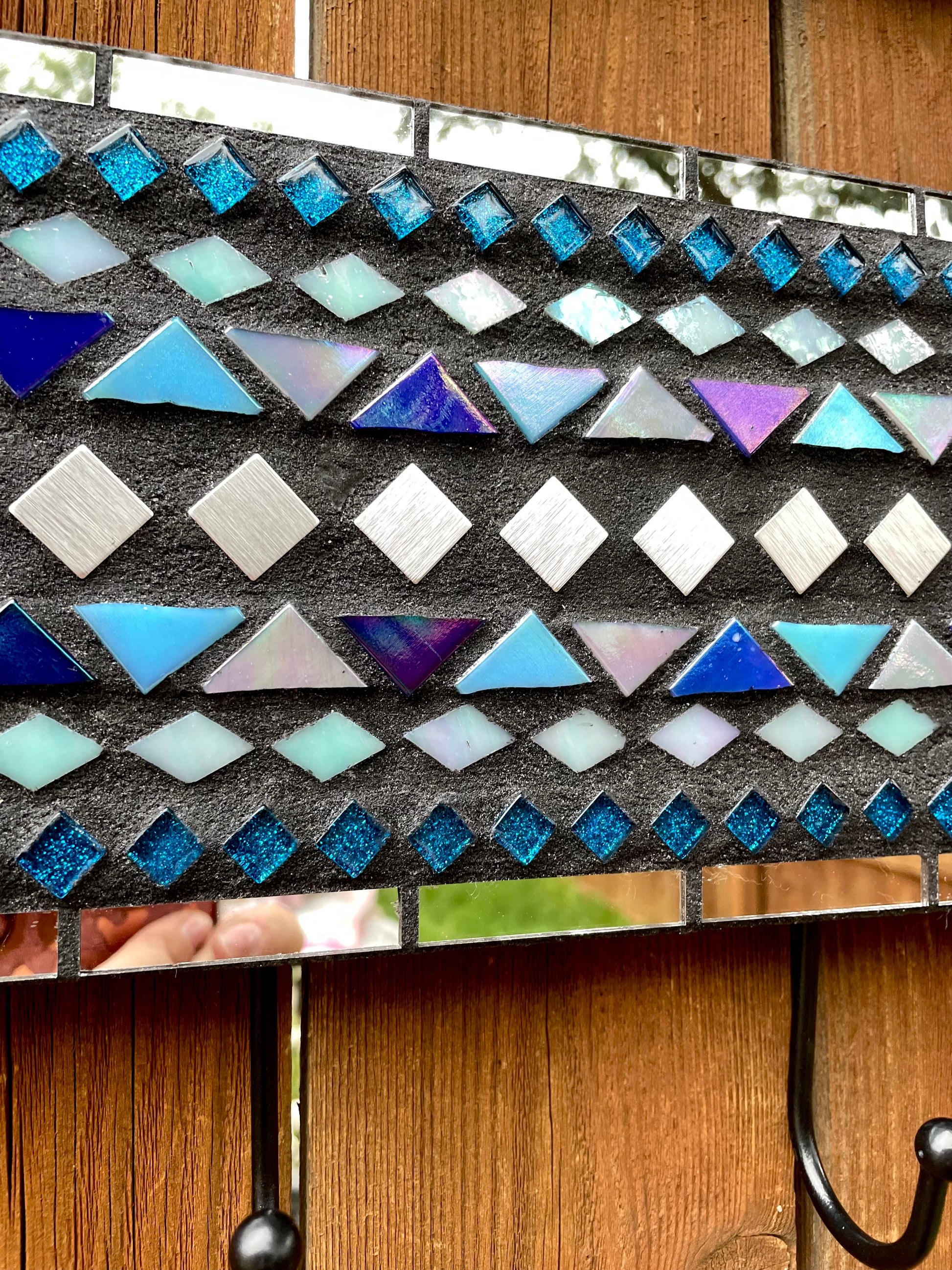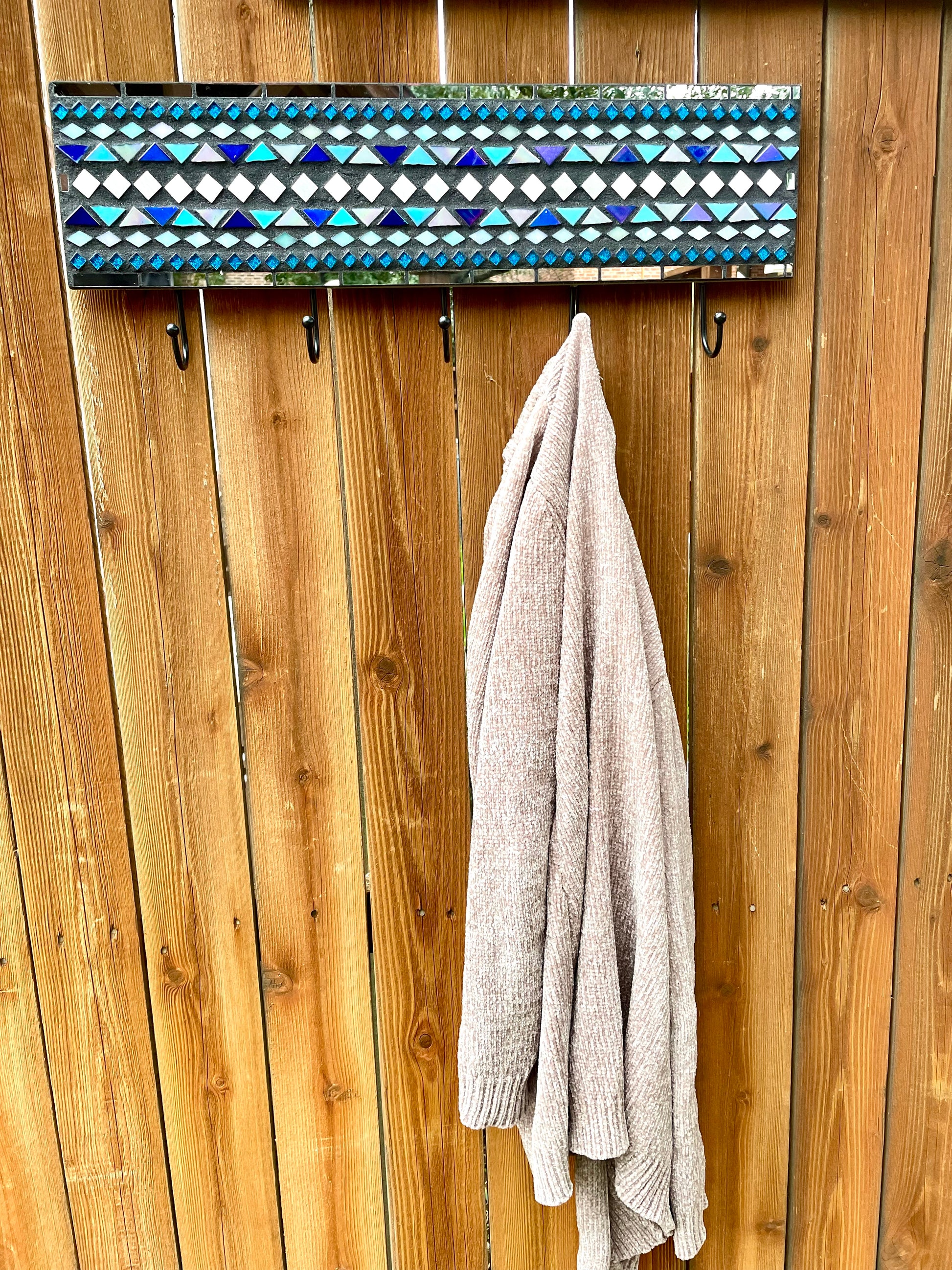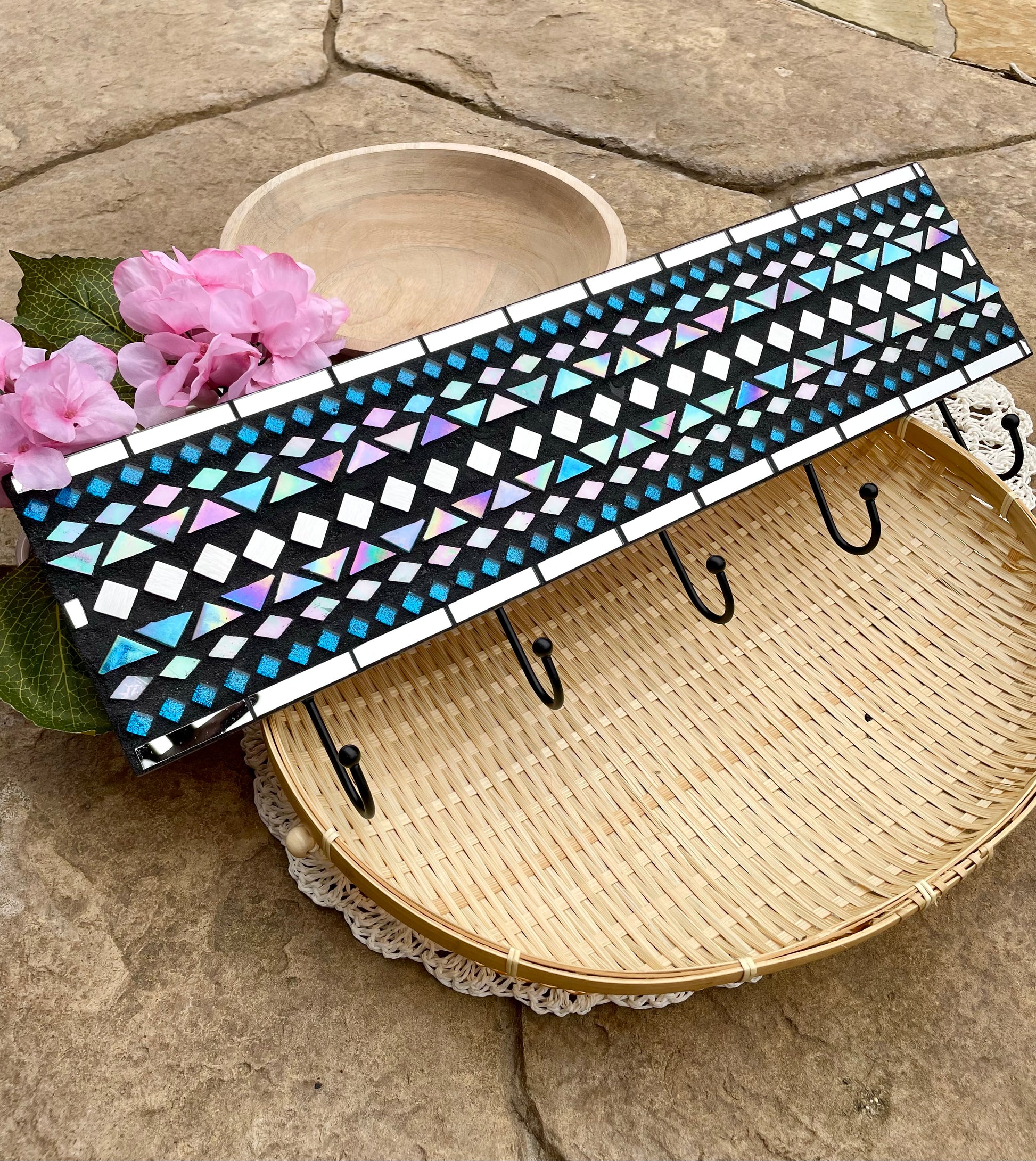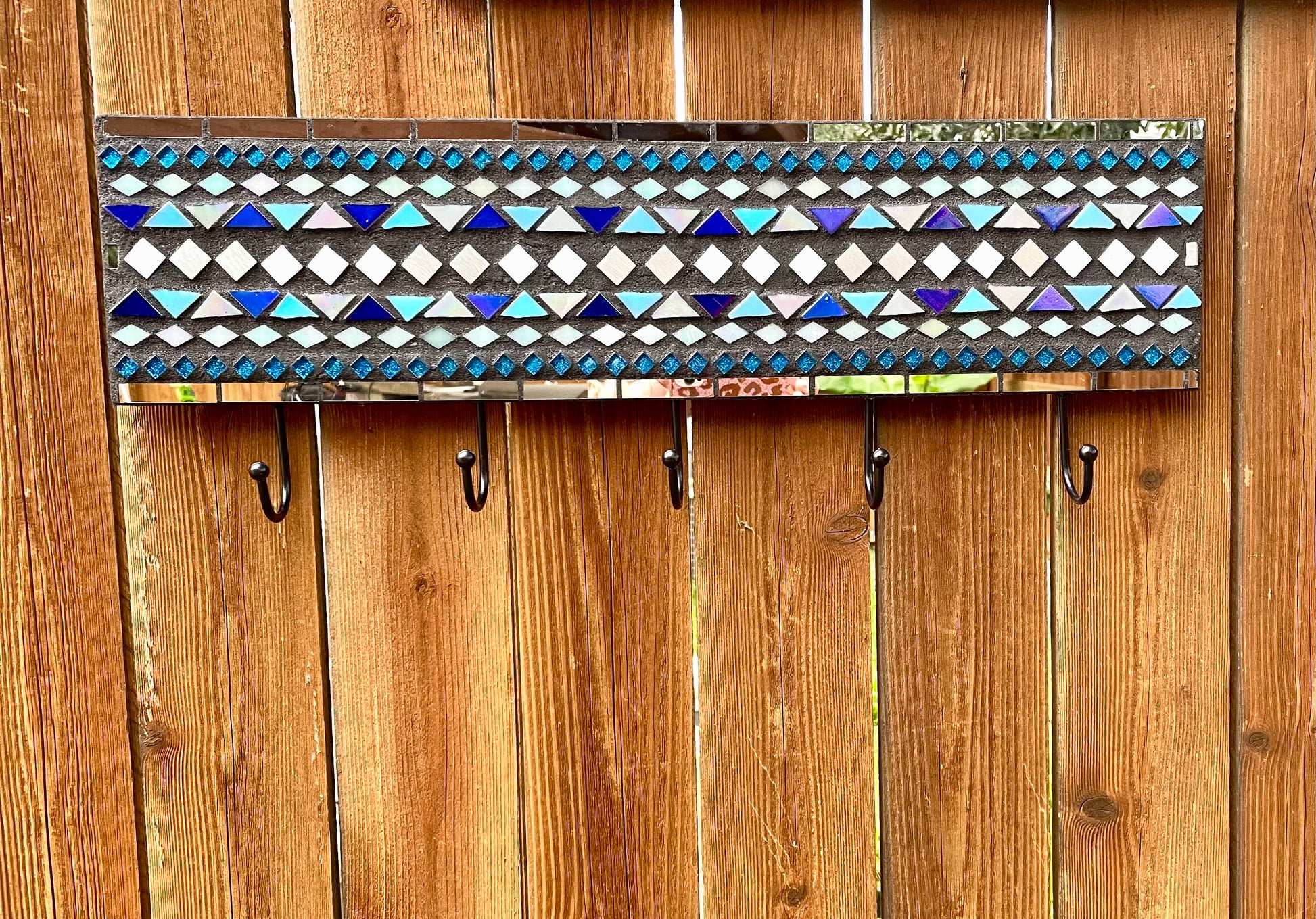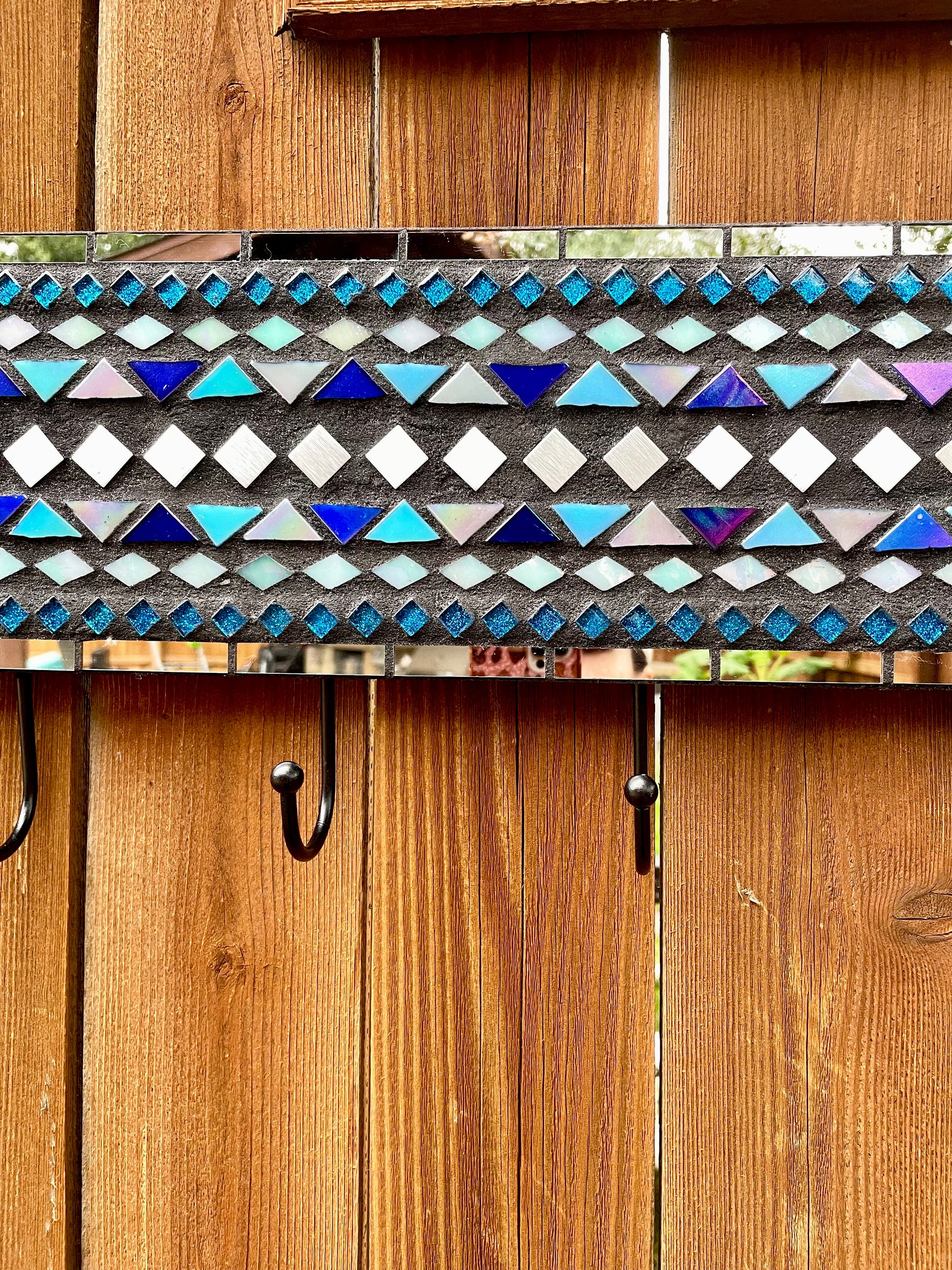 Handmade mosaic coat rack wall hooks. Beautiful wall hook made with iridescent tiles and glass and mirror on a wood base. Be unique and give this as a unique housewarming or wedding gift to a special couple.