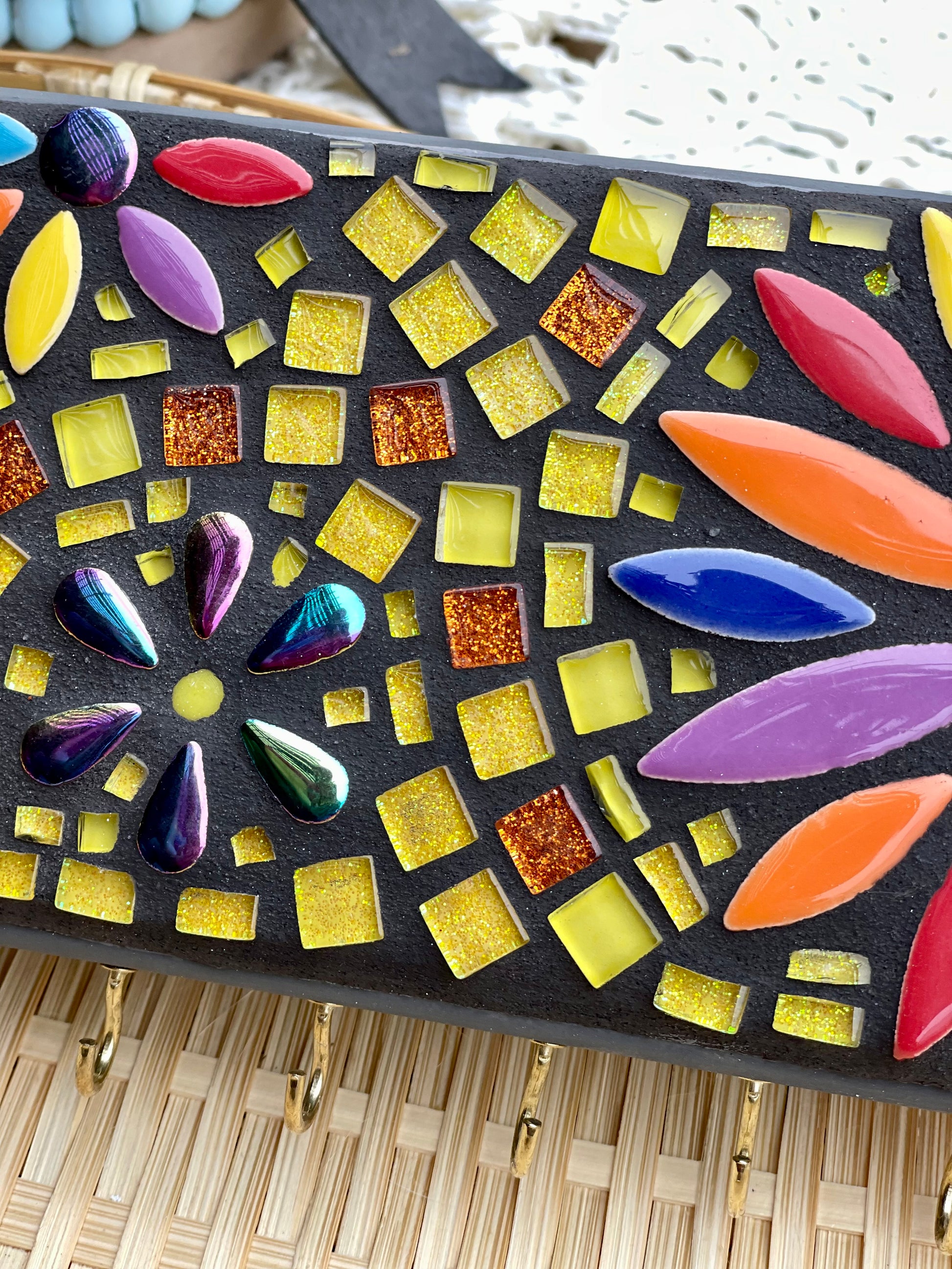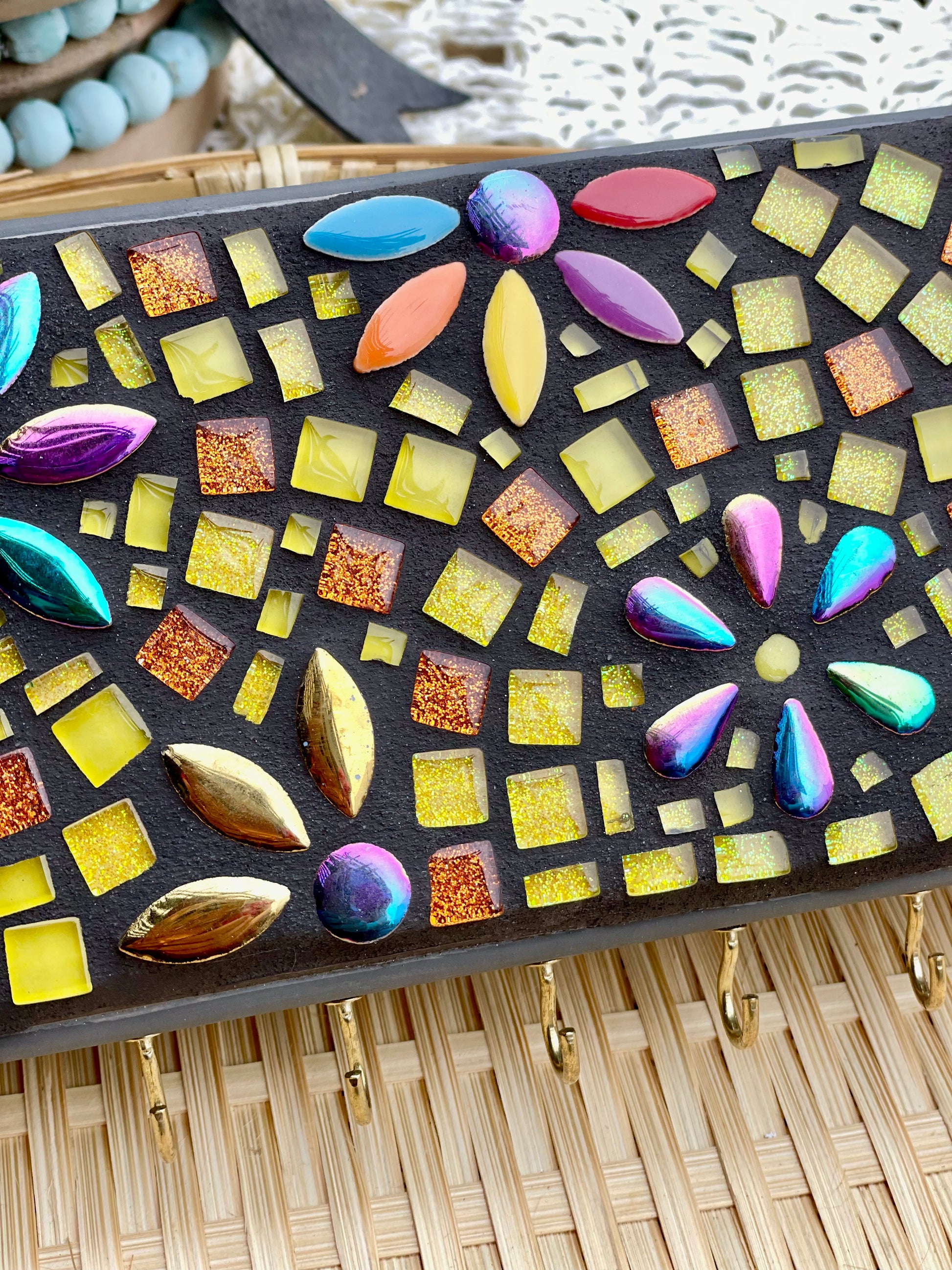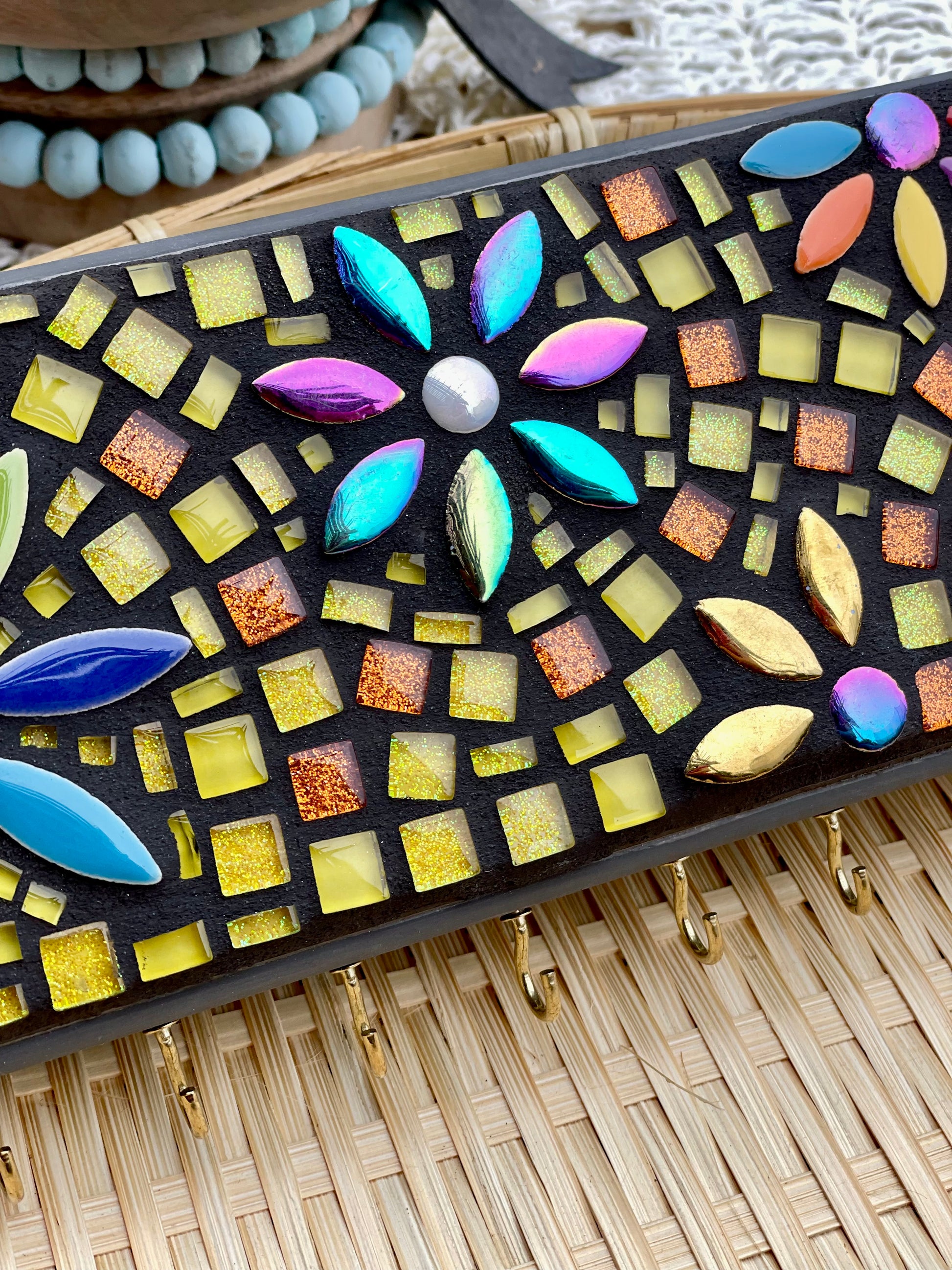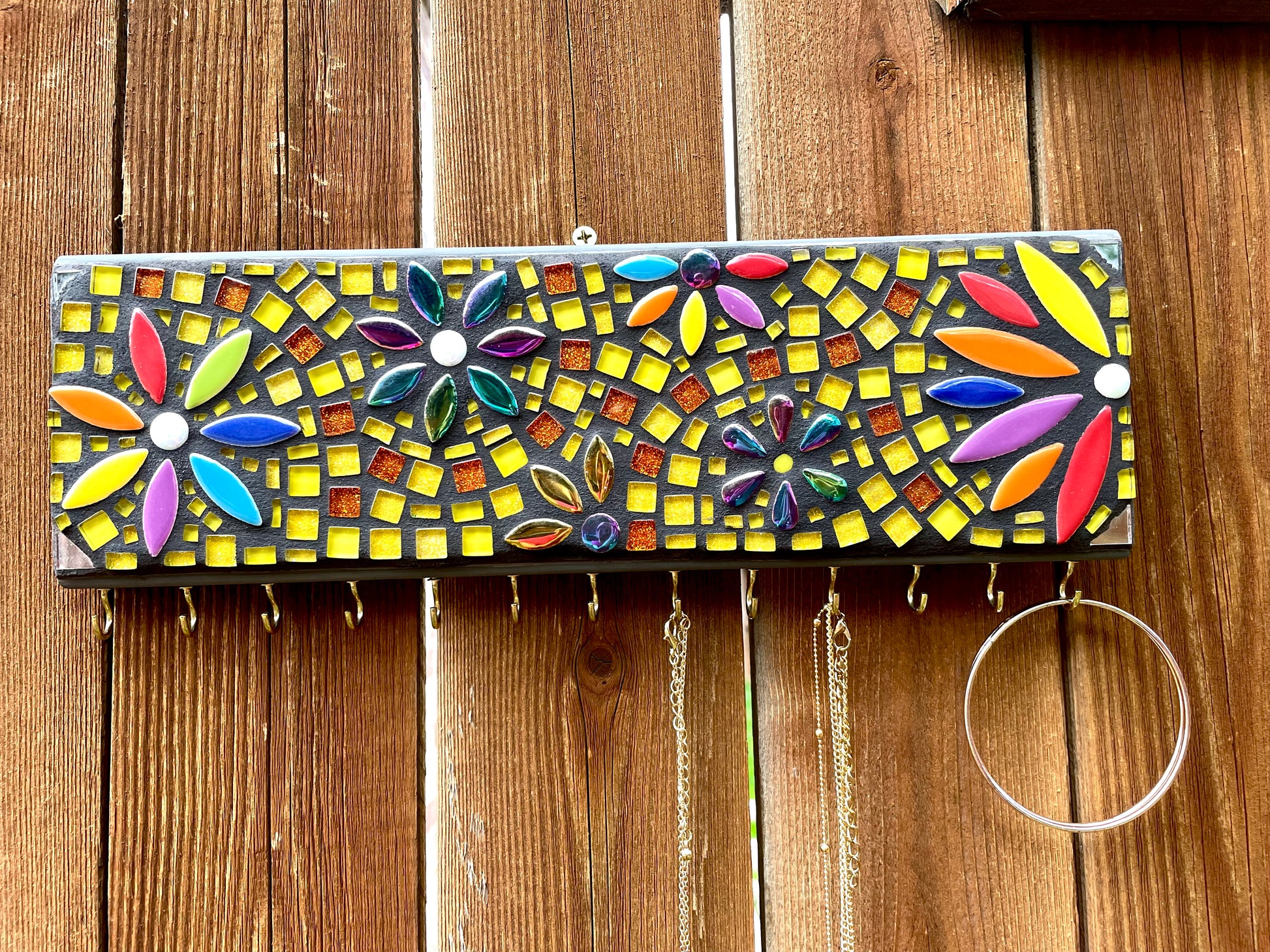 Beautiful handmade necklace holder display. Made with glitter tiles and ceramic pieces with black grout. This necklace display can hold keys also. I like to make decor that is beautiful but also useful.