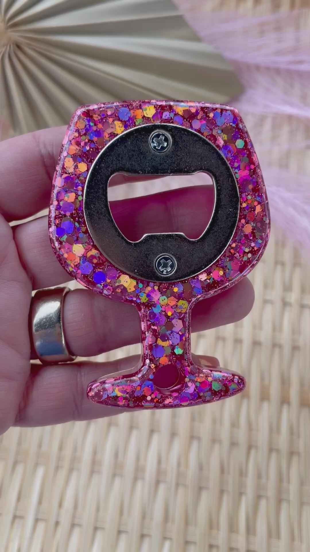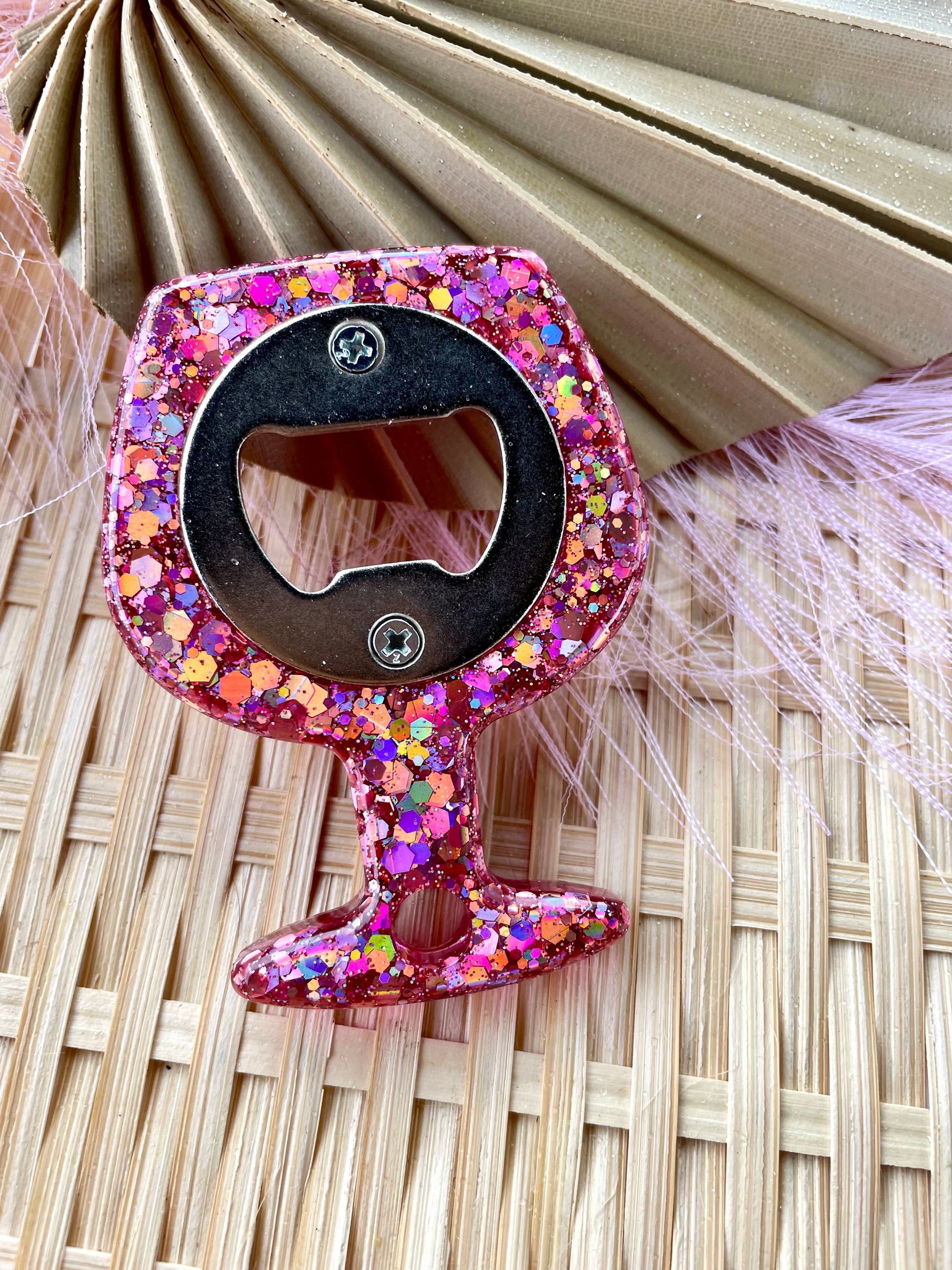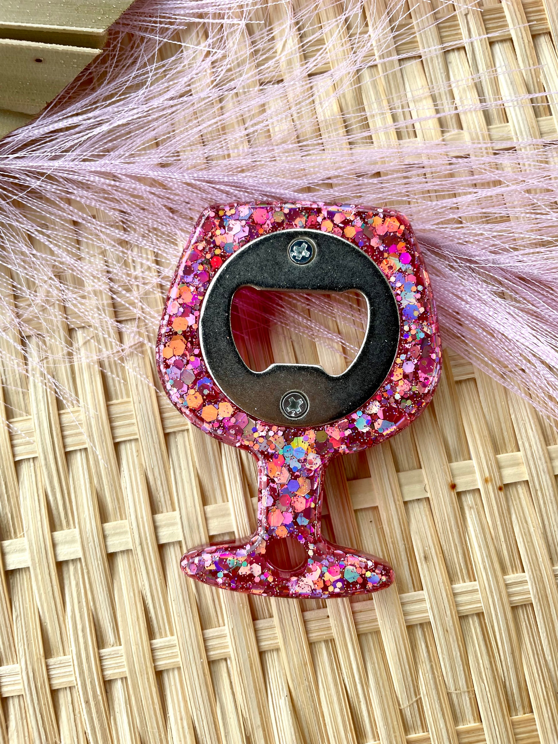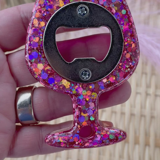 Pink glitter bottle opener. Super sparkly made with glitter and resin. Great to add to a housewarming or hostess gift. Cute wine glass shape.